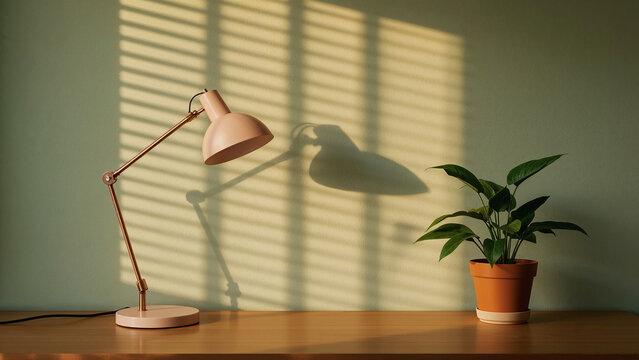 Pink desk lamp and green plant on wooden desk with window light shadows table lamp