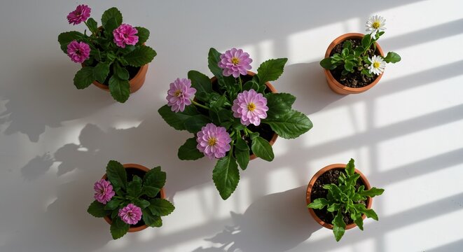 Overhead view of potted flowers on a white surface with light