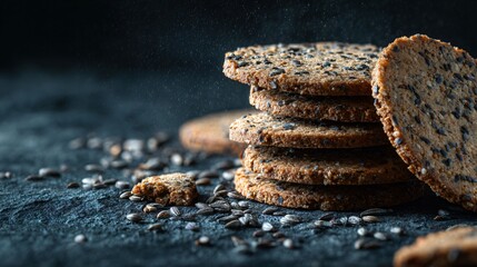 Clean arrangement of Scandinavian rye cookies with caraway seeds, placed on cool charcoal background, generous copy space