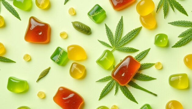 A colorful assortment of gummy candies and sweet treats with berries, leaves, and heart shapes