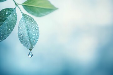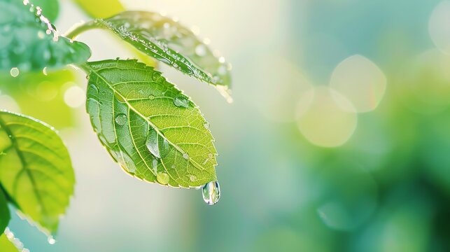 Green leaf with a dew drop on the tip against a blurred green background, green leaf, morning freshness