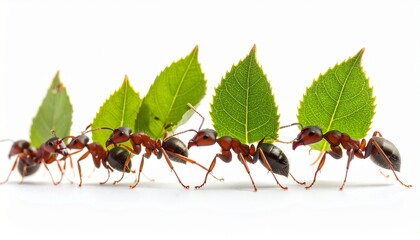Ants carry a green leaf teamwork concept. Insects transport foliage on a forest floor. Close up showcases nature cooperation group work in a vibrant natural environment. Leafcutter ants working.