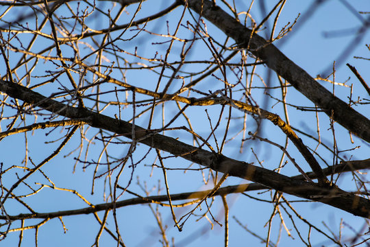 Old oak. Branches of a large tree against the sky. Winter, cold weather, leafless vegetation.