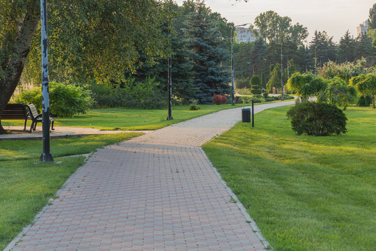 A beautiful summer green park with a brick pavement and walking path in the city