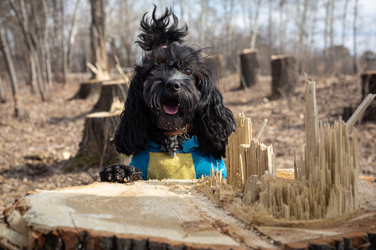The dog leaned on a stump of a freshly sawn tree in a spring park in the afternoon.