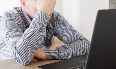 A bearded man in casual clothes leaned his head against the wall with a depressed look. Dim indoor lighting