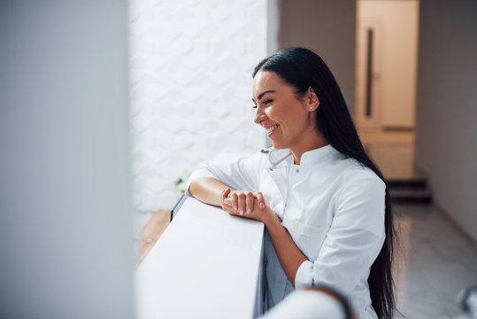 Positive smiling nurse stands in the reception of clinic and leaning on the table