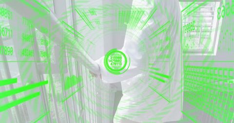 Young professional woman leaning on balcony analyzing currency icons with skyline