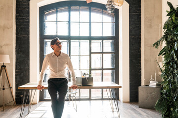 Businessman is standing in his office, leaning on his desk and thinking about a business strategy