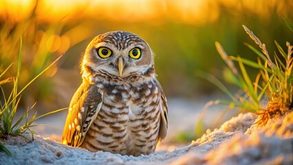Burrowing owl tilts head outside burrow on Marco Island at sunset