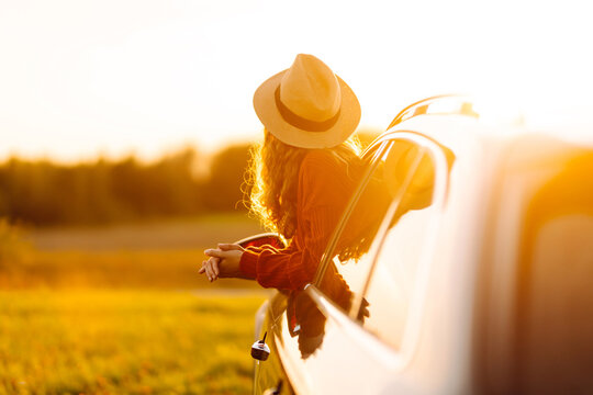 Woman enjoying tranquil beach sunset views from car window