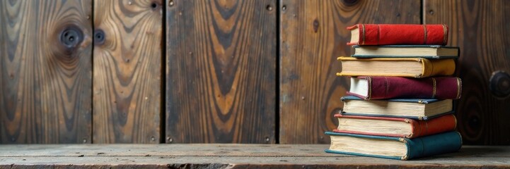 Tall stack of colorful hand-drawn books with varying sizes and textures, leaning against a wooden wall , art, stack, books
