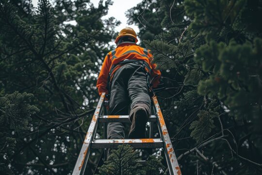 A man in an orange safety vest is climbing a ladder. The ladder is metal and is leaning against a tree
