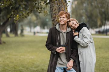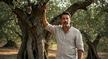 Man leaning thoughtfully against old olive tree in sunlit grove. Handsome male connecting with nature in Italian countryside. Concept of Italian and Greece heritage. Product with olive oil concept.
