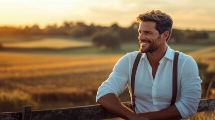 Man in a white shirt and suspenders, smiling while leaning on a fence overlooking a rural landscape with fields and trees blurred in the background