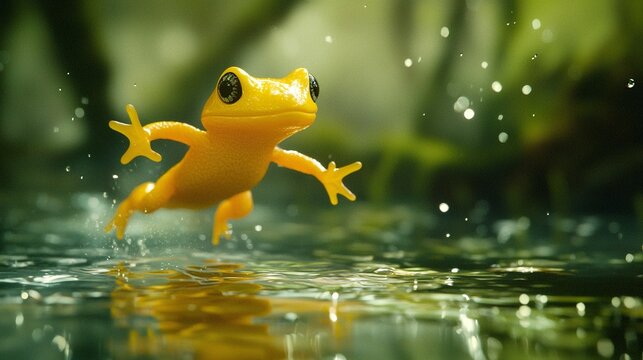 Golden frog leaping in jungle stream, splashing