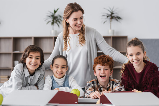 Teacher, learning and helping girl in classroom for knowledge, studying and assessment. Preschool smile, development and happy kid or student with woman for education with notebook in kindergarten.