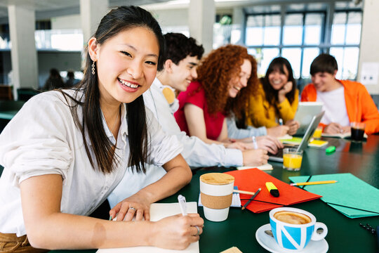 Portrait of asian college student woman smiling at camera sitting together with her university classmates at cafeteria campus. Teamwork and education lifestyle concept