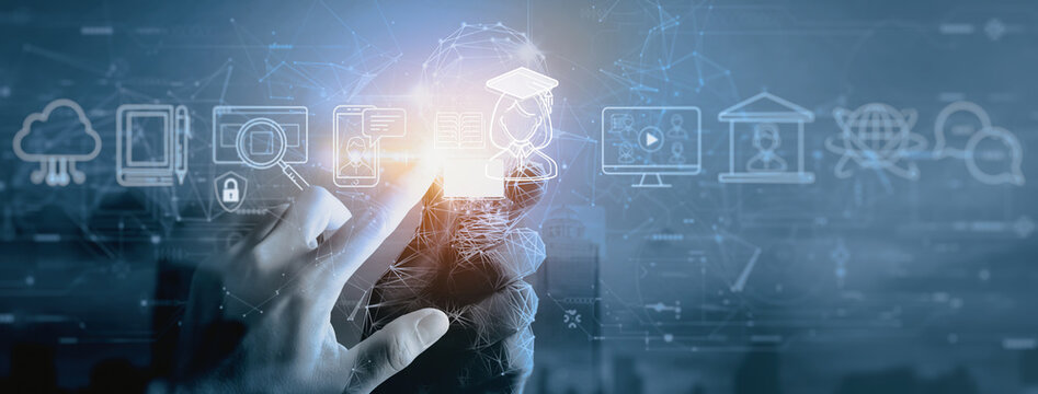Concept of Online education. man use Online education training and e-learning webinar on internet for personal development and professional qualifications. Digital courses to develop new skills.