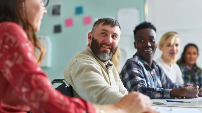 A multiracial man with Down syndrome showing compassion and empathy while working as a social worker in a community center. Learning Disability