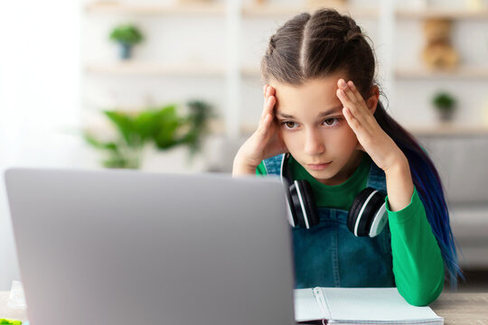 Sad tired schoolboy doing homework. Little child struggling with his assignment. Education, school, learning difficulties concept.