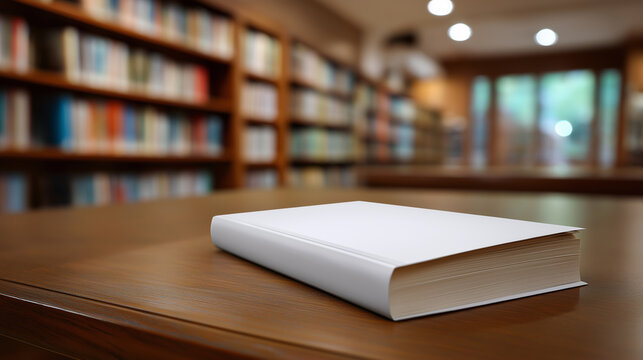 A single closed book lies on a wooden table inside a quiet library filled with shelves of books.