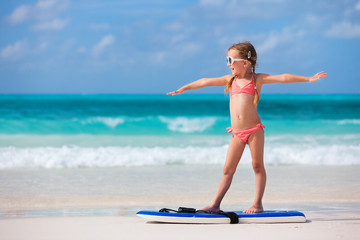 Little boy surfing on tropical beach. Child on surf board on ocean wave. Active water sports for kids. Kid swimming with surf. Surfing lesson for kids