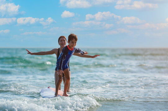 Happy little child boy learning to play surfboard from his mother with having fun and passion in sea on summer vacation at tropical beach.
