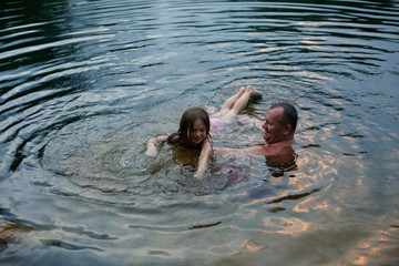 Young diverse boy swimming underwater in a swimming pool. Learning to swim with the help of his parent. Photo below the water showing a child practicing diving under the water