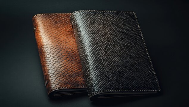 Two leather-bound journals, one brown, one black, laid flat on a dark surface