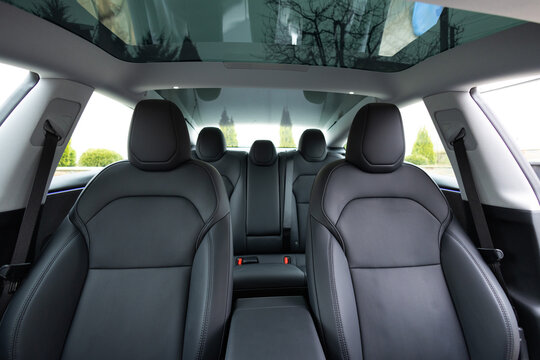 Panoramic glass sun roof in the modern electric car interior. The view from the empty car with seats. Luxury car leather seats. Interior of new clean expensive car. Passenger seats with leather