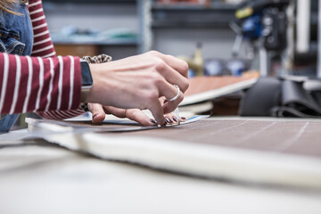 Close-up of craftswoman cutting leather material with precision in workshop