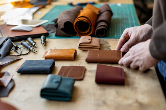 Craftsman hands laying out leatherwork on wooden table at leather workshop. Handwork accessories