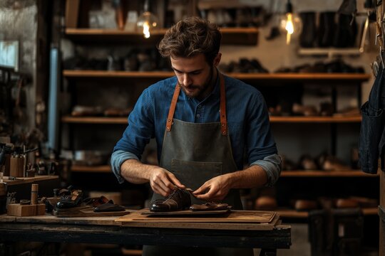 Skilled shoemaker crafting leather shoes in artisan workshop