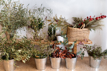 Fresh fragrant stems of narrow leaved black peppermint tree and rosemary placed on metal buckets with Loropetalum plant leaves in flower market