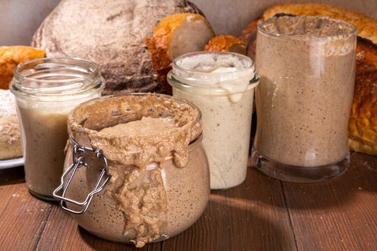 Fresh homemade bubbly sourdough starter, a fermented mixture of water and flour to use as leaven for bread baking, on wooden table