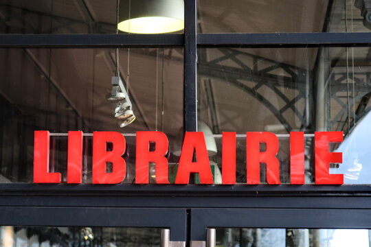 Librairie. Enseigne de magasin. Lettres rouges sur vitrine.