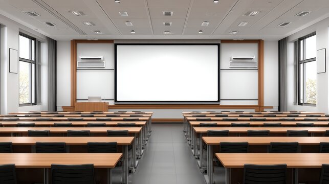 Empty university lecture hall, projector screen, autumn view