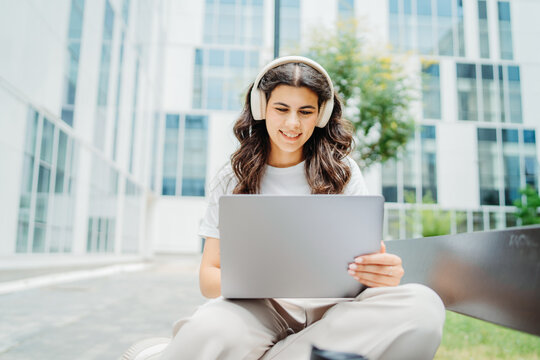 One beautiful young caucasian woman student sitting on bench near university listening to music and studying on laptop