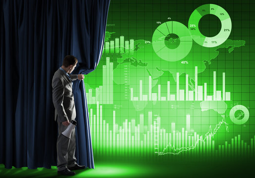Neon green-cyan financial waveform tracking on led grid display for data analytics and ai