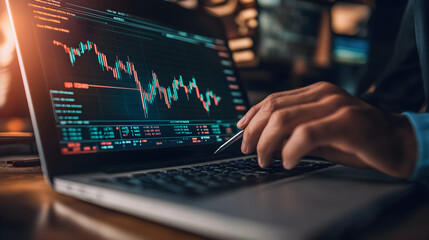 A person is intently studying financial data on a laptop screen, focused on the stock market trends