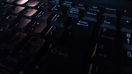Close up view of workplace with led rainbow backlight gaming keyboard of computer, lying on table in dark room
