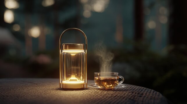 Modern LED lantern with adjustable golden glow illuminating a transparent borosilicate glass cup of steaming tea, on a textured outdoor table