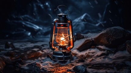 Photo of travel camping led lantern standing on cracked ice surface on dark background.