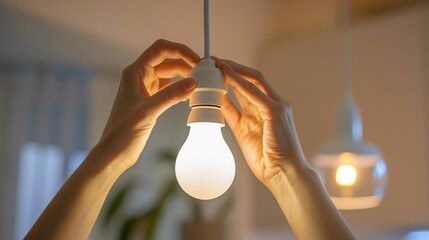 A young woman is changing a light bulb from an incandescent bulb to an LED bulb.