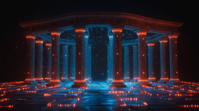 A large, empty building with blue and red pillars. The blue pillars are lit up and the red pillars are lit up as well. The building appears to be a large, empty space with a futuristic feel