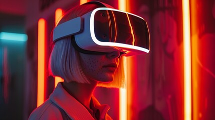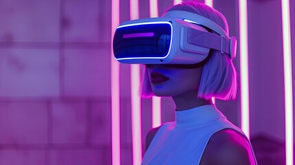 Young girl model with short white hairs wearing a VR visor viewer, purple led lights on the VR and on the wall behind her