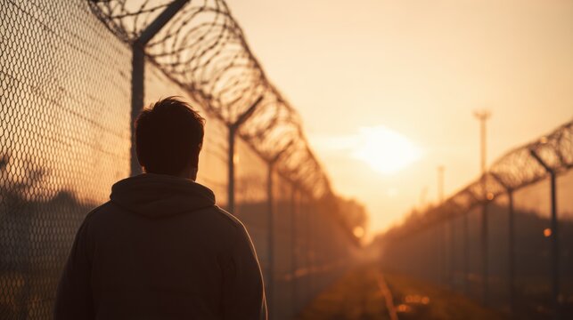 man standing with back view at left side of frame, facing a tall prison fence with barbed wire during golden sunset