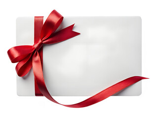 A white rectangular card with a red ribbon tied around the top left corner on a transparent background