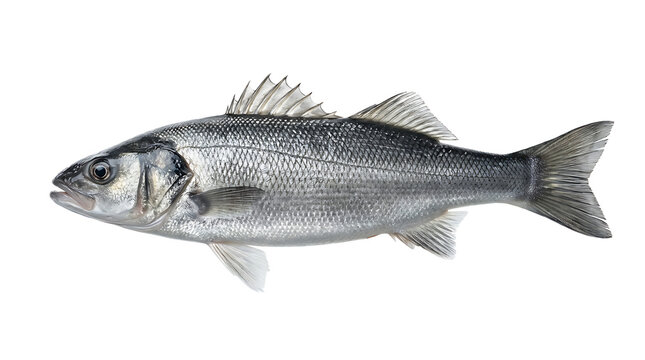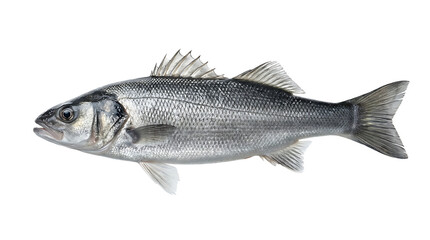 Whole silver fish side profile facing left studio seafood isolated on pure white background